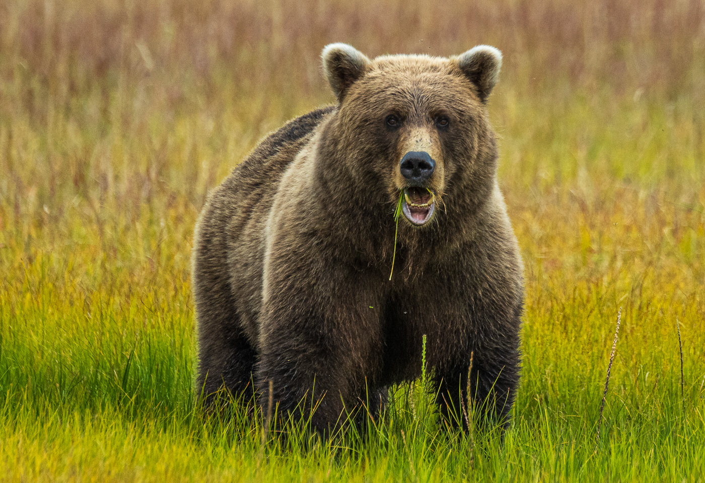 Grizzly eating wild grass in a meadow