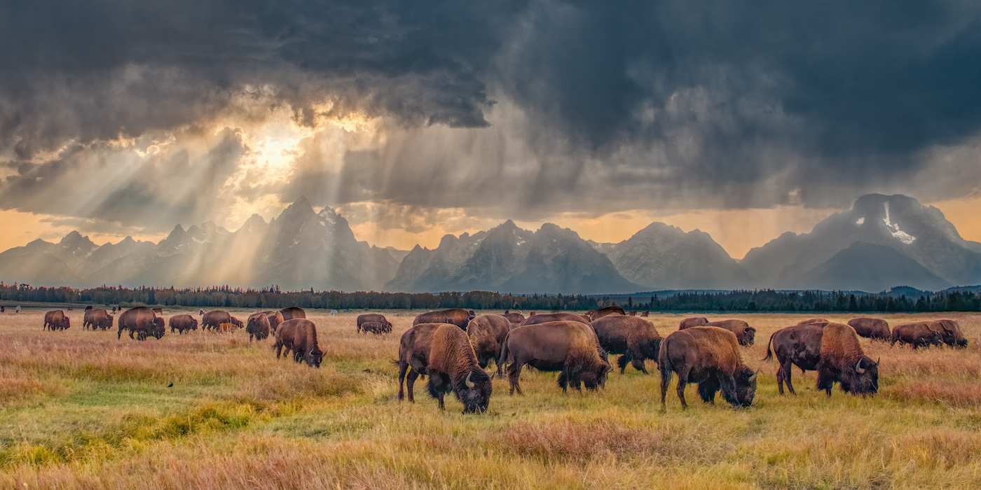 Bison herd at sunset in Grand Teton