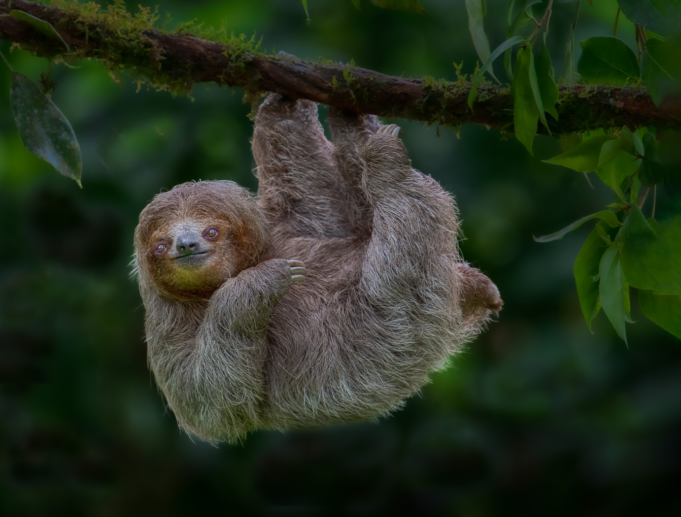 This three-toed sloth seems to be having a grand old time swinging from a vine and smiling at the viewer.