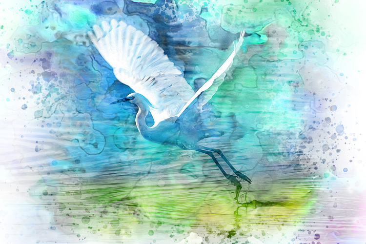 Egret taking flight, digitally simulated watercolor.