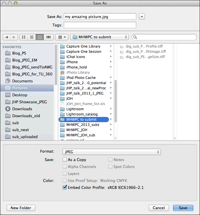 - make sure Color: Embed Color Profile: sRGB IEC61966-2.1 is checked