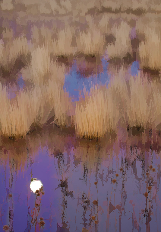 The original image is a moon reflection between grasses and dried seed heads. I used a couple of Topaz filters on separate layers in PS, then applied masks to combine elements of three layers.