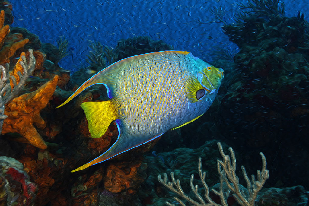 I chose the brush effect to bring out more color and detail in the Queen Anglefish, reef and water. The image was underexposed because the camera must be preset prior to the dive and light conditions changed.