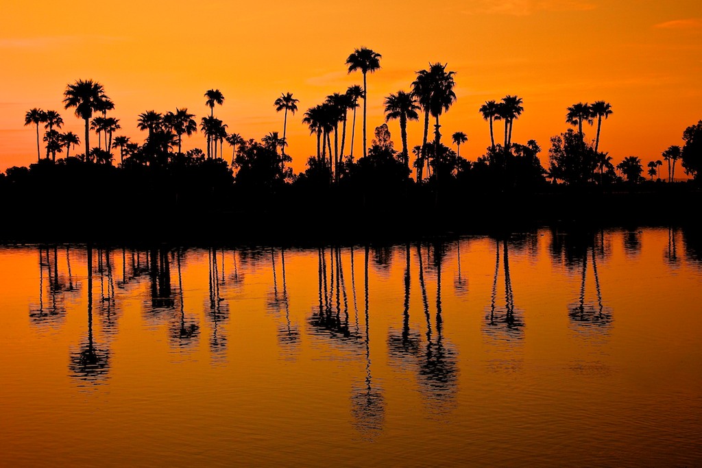 Silhouetted palms at sunset
