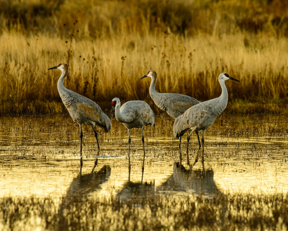 Four Sandhill Cranes standing in water just before nightfall.