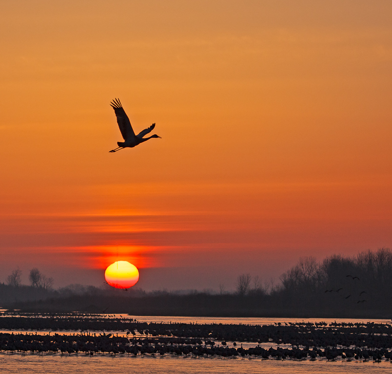 Sandhill cranes leave their roosting spot on an island in the river at sunrise, to return to the corn fields. This crane was the first to Launch as the sun was rising.