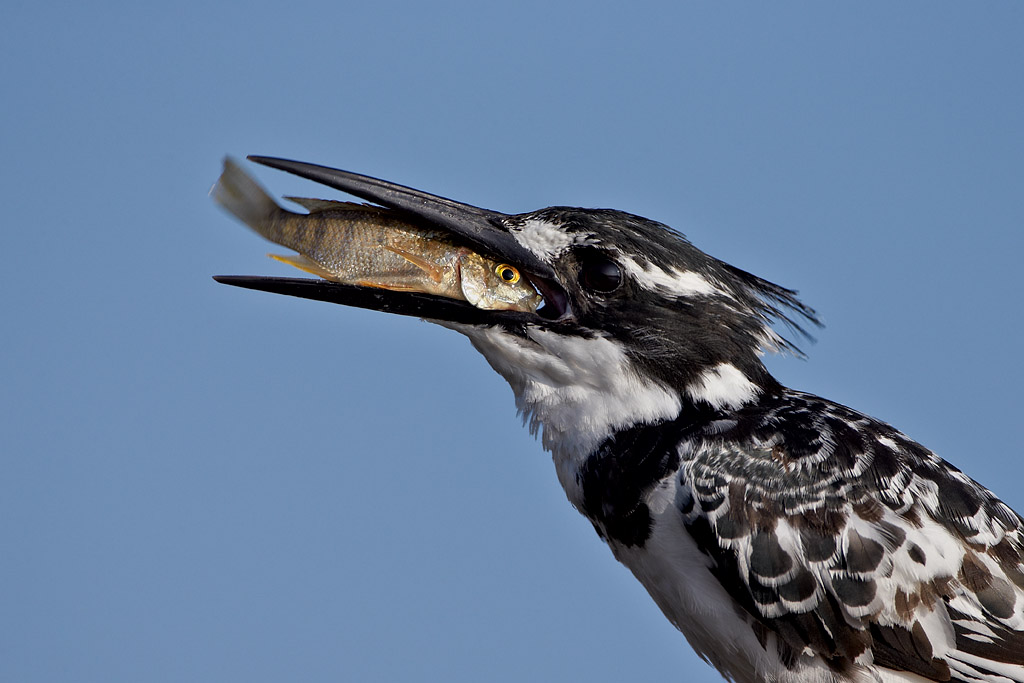 This pied kingfisher is about to swallow a fish that it caught for breakfast.