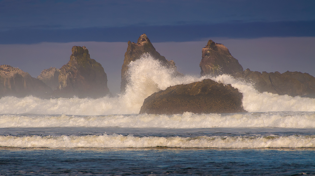 Taken during my May tour to the Oregon coast during a full moon and high tide. The symmetry of the 3 waves coincided perfectly with the crashing wave that was framed by the distant sea stack.