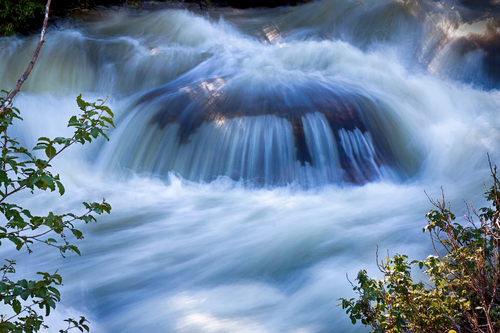 Water rushing over a large boulder
