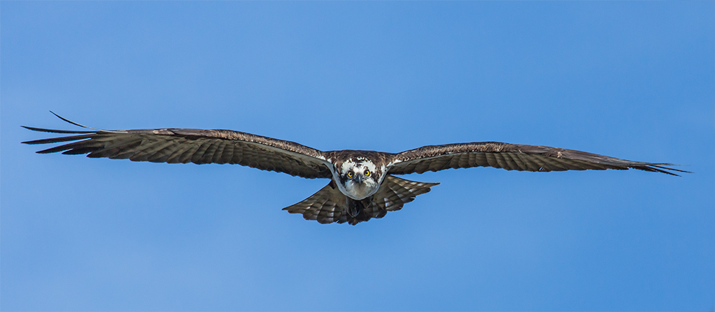 An osprey descends from the nest and flies directly overhead by a few meters as a warning that someone may be too close to the nest.