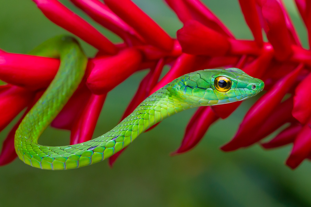 I photographed this beautiful Parrot Snake during my Audubon prize trip. I love the color combination of the bright green snake against the deep pink of the Ginger flower.