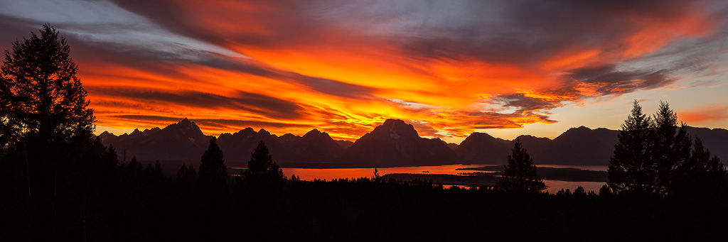 Fiery sunset from Signal Mtn. looking west towards Tetons and Jackson Lake