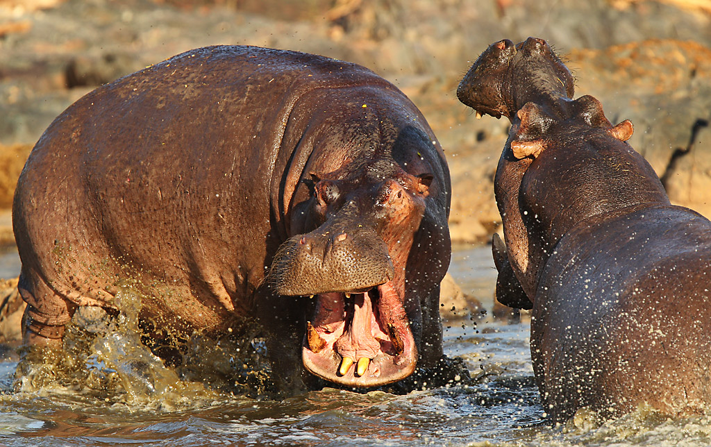 Hippo fight in a pool. I was sitting at water's edge with a 300 mm +1.4x TC. Great morning light.