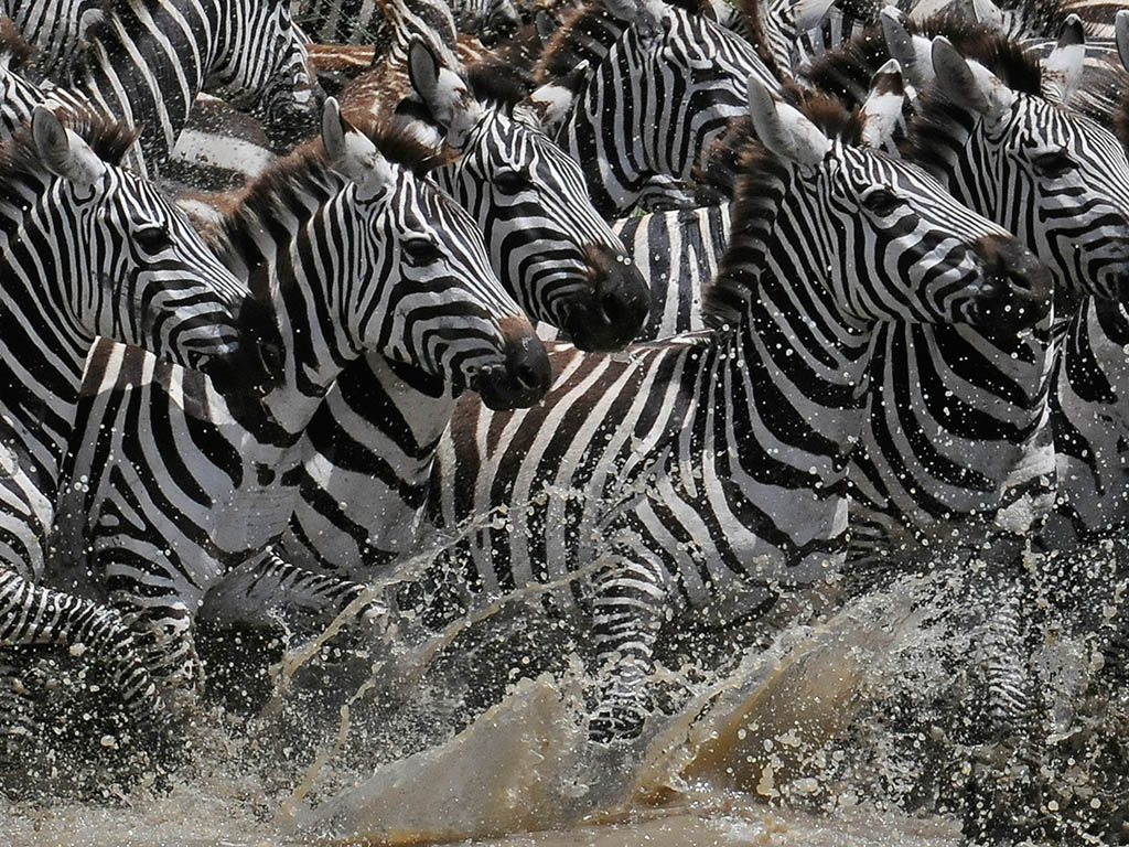 Part of the massive herd of Zebras stomped in and out of the water in the central Serengeti. Thirst drives them to the water while the threat of danger from crocodiles and nearby lions make them skittish and forces them to suddenly flee at the slightest hint of disturbance.