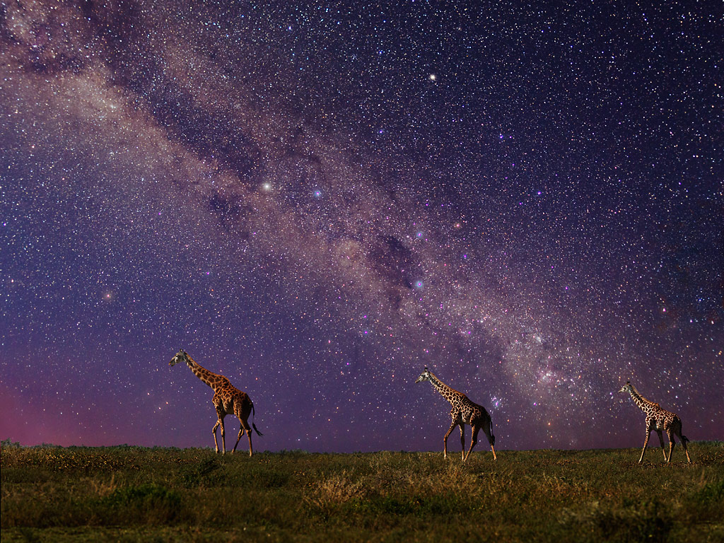The sky was photographed from the Moru Kopjies from our tented camp early in the morning, 12 ten-second exposures averaged. The giraffes were photographed a couple days later in the morning, looking in the same direction (south). The Milky Way shows the southern cross and the dark coalsack nebula to the left of the cross. When I saw the giraffes, I knew I was making the image for this composite.