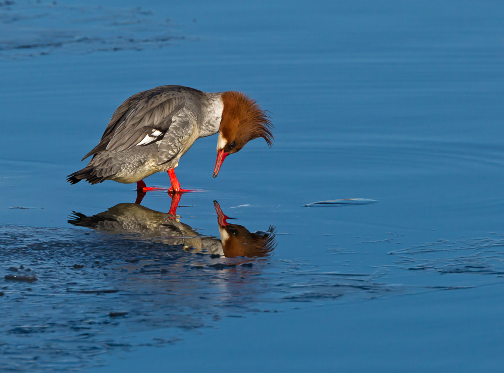 Water over Ice allowed for the Merganser to stand and look at her image