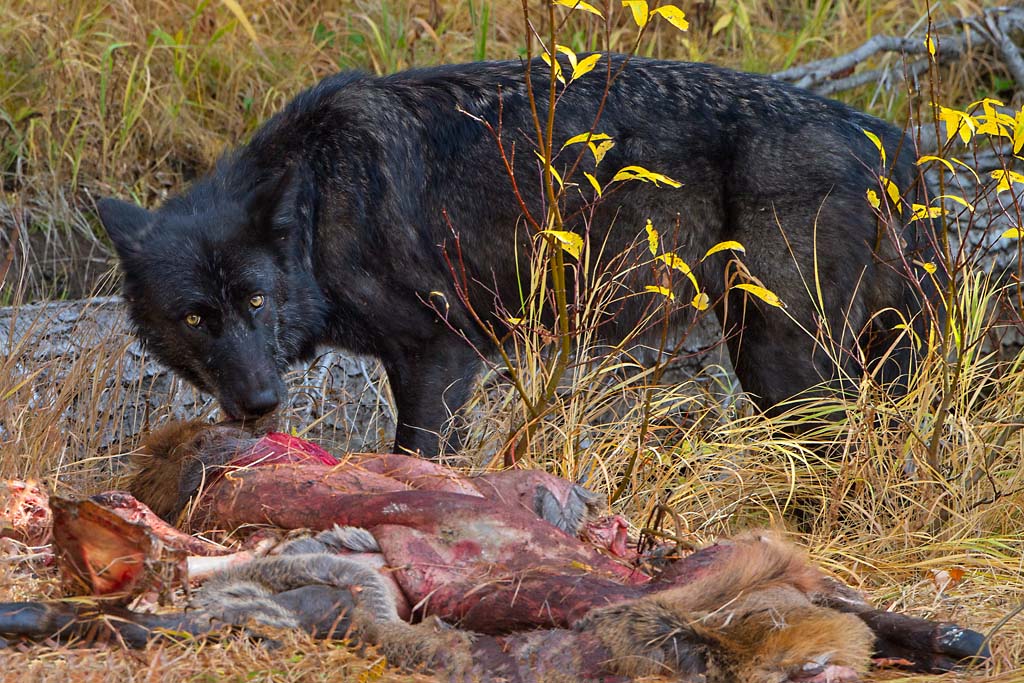 The alpha pair of the Canyon wolf pack took this cow elk down the previous day. When I arrived about 3 pm, there was a coyote feeding on the kill but then this 2-year-old black female came in and chased it off. It was really exciting to see this beautiful wolf so close.