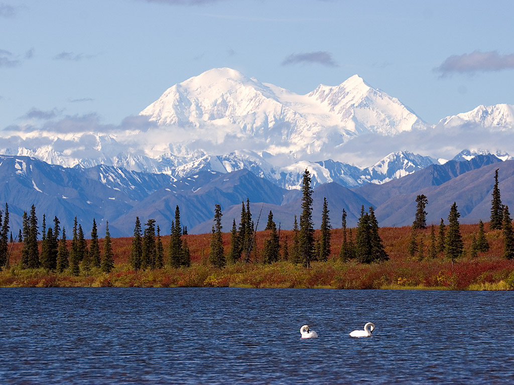 Trumpeter Swans on small lake with fall colors and towering Mount McKinley background.