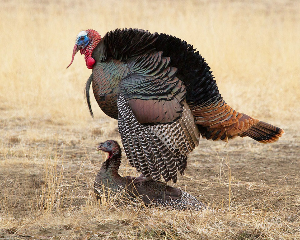 Spring is mating season for the Wild Turkey. The tom turkey strutted with his feathers making a grand display for a long time before the hen was ready to mate.