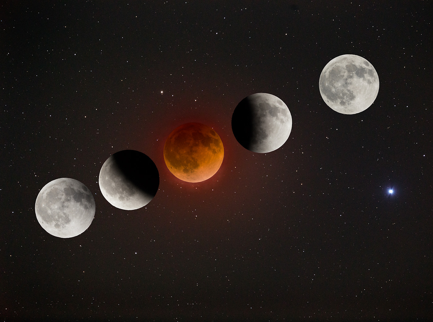 The Lunar eclipse of April 15, 2014. During mid eclipse, with the Moon quite dim, many stars can be seen and photographed near the Moon. Added to the mid eclipse image, are other views of the Moon during the eclipse. The Moon images in partial eclipse, flanking the copper-colored mid-eclipse, nicely demonstrate the round shadow of the Earth, proving the Earth is round.