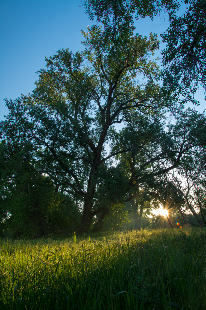 Morning sun filtering through trees in South Platte Park