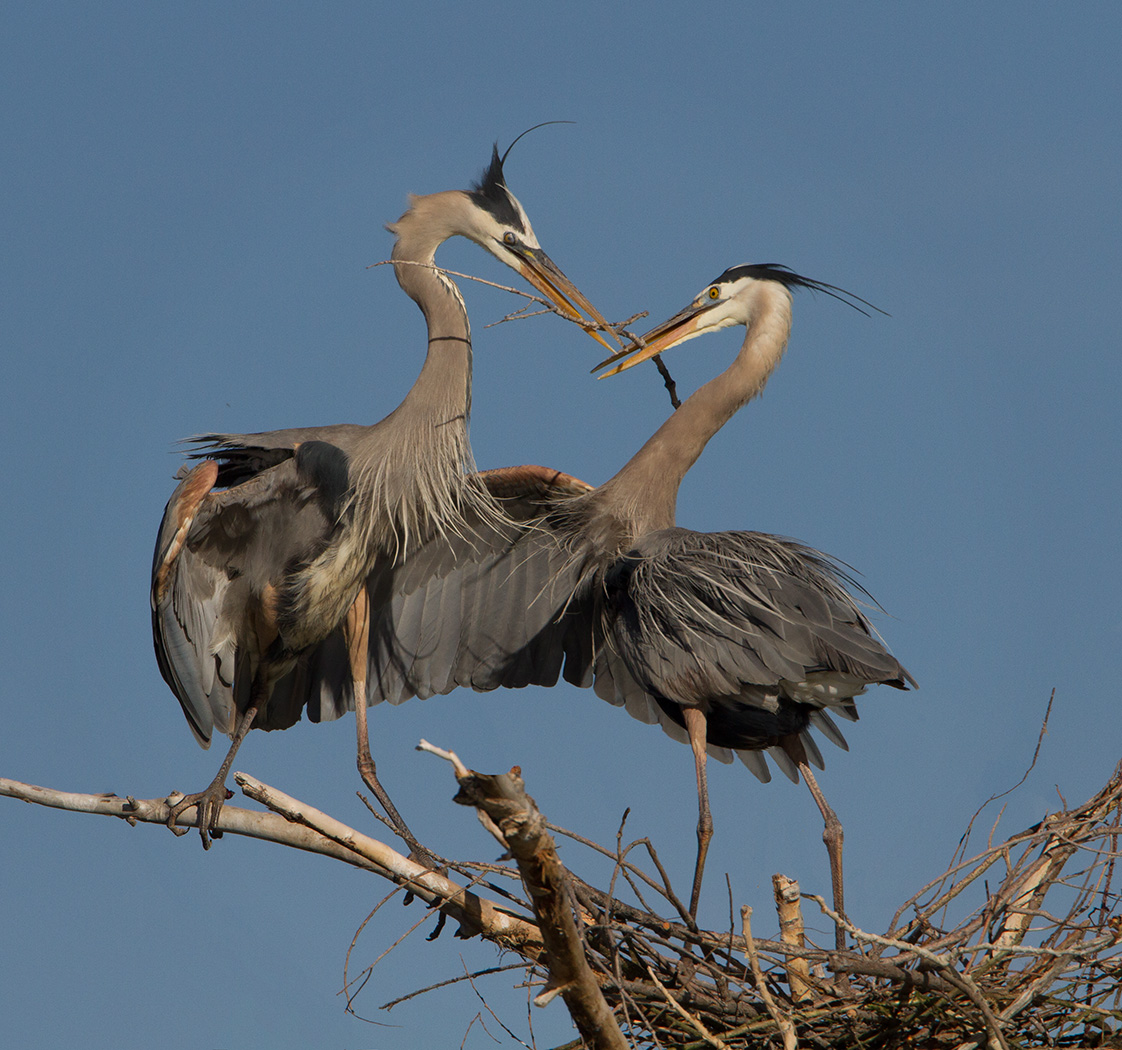 The male gathers sticks and ceremoniously presents them to the female so she can build their nest. When she stretches her neck straight upward, she's saying, "Let's make babies."
