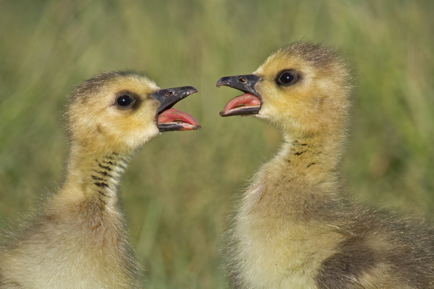These gosling siblings seemed to have a contentious relationship. Before this photo was taken, they had been nipping at each other's beaks.