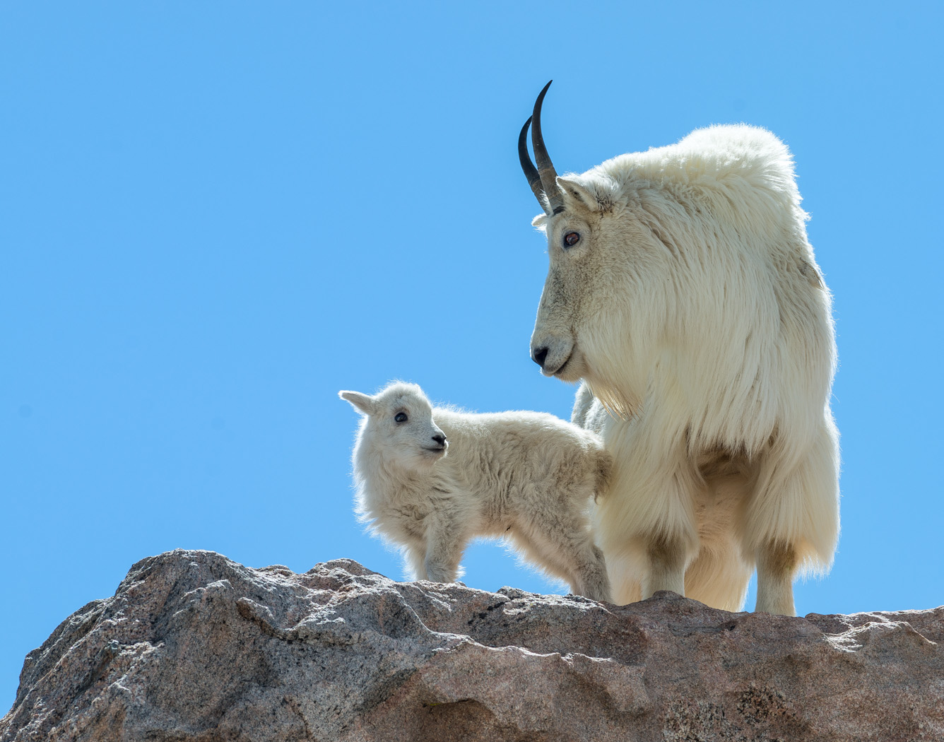 A nanny goat and her kid share a loving look near the summit of Mt. Evans, CO.