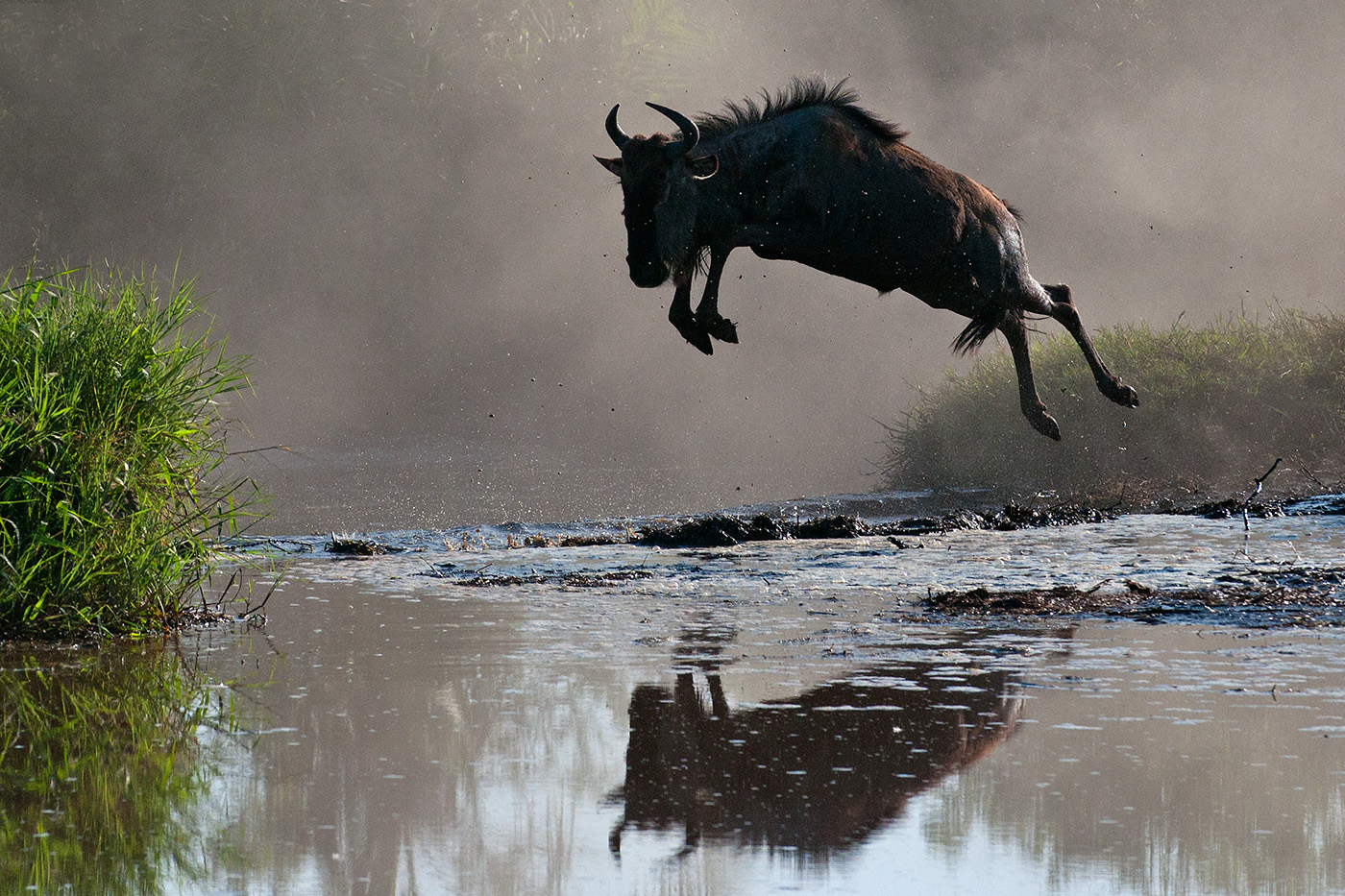 I took this image early one morning at a very small river crossing. The crossing had a concrete spillway, used by vehicles, that the Wildebeest did not like and rather than step on it, most chose to jump.