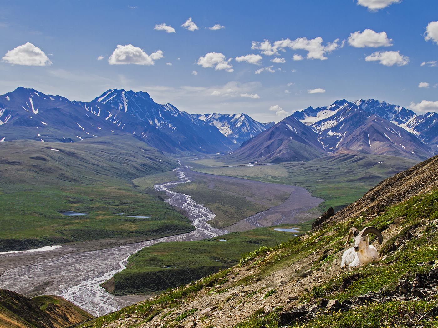A Dall Sheep ram takes a break to enjoy the view at Polychrome Pass, Denali National Park.