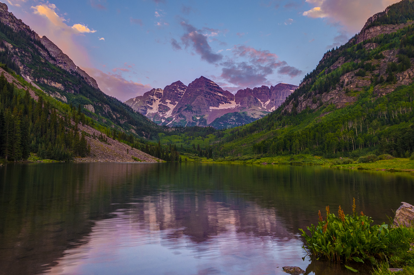 Wildflowers bloom along the shore of Maroon Lake before sunrise at Maroon Bells Recreation Area.