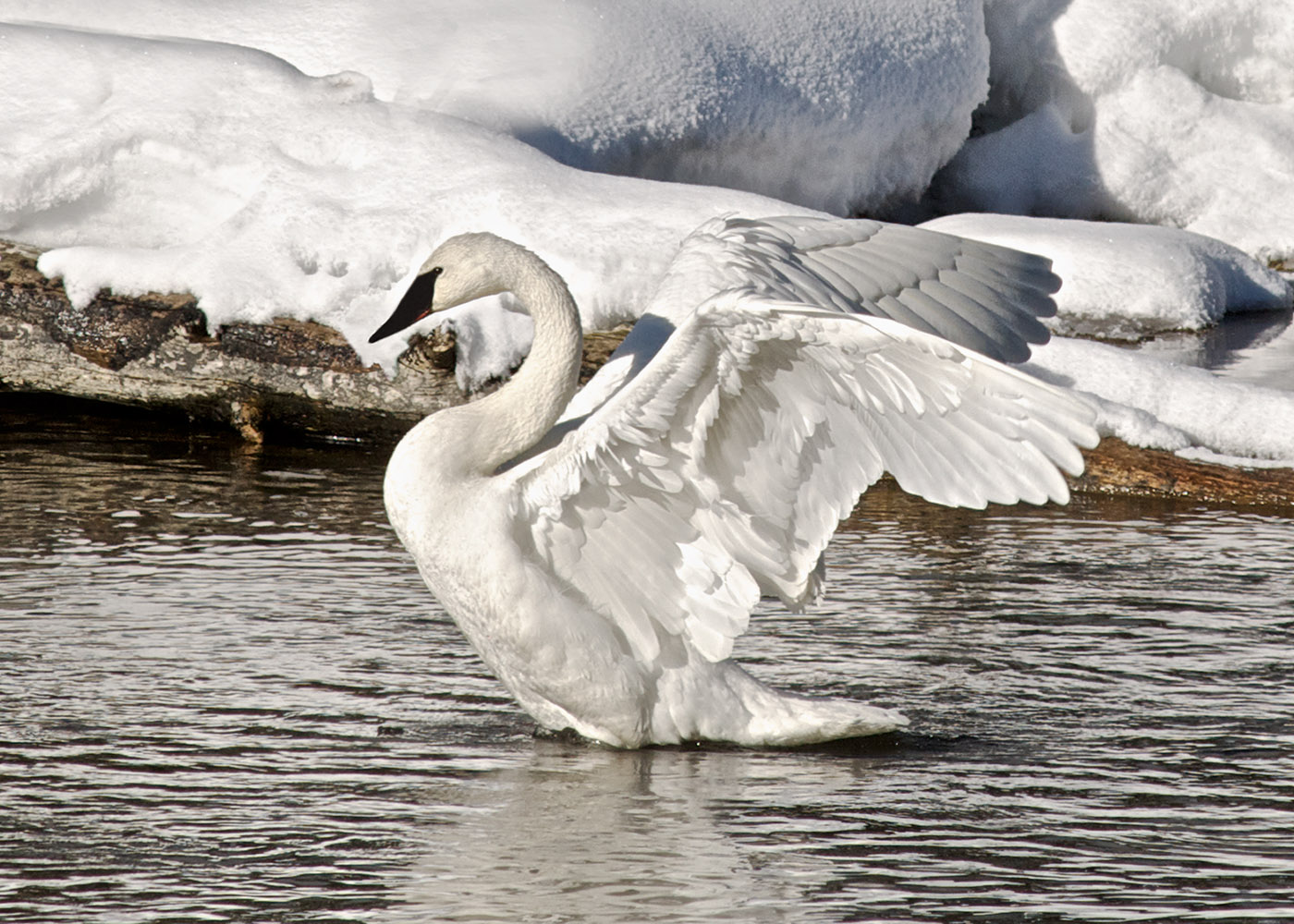 While on a morning photo shoot in Yellowstone early this past February, we located trumpeter swan on the Fire Hole River. Fortunately, one raised his wings for this long-awaited shot.