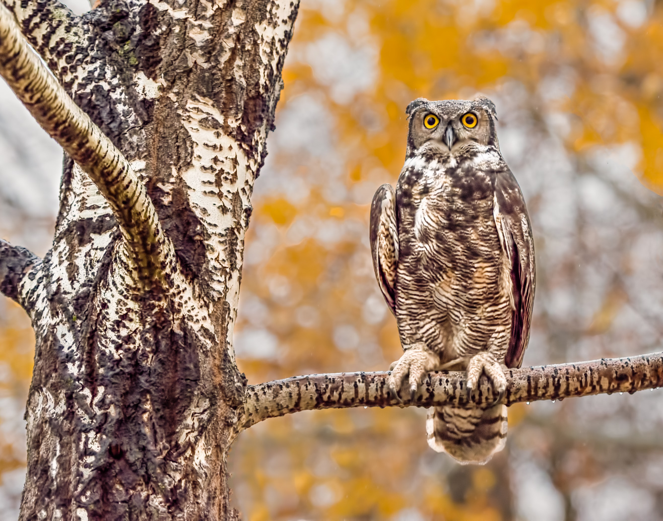 During a raptor shoot on a snowy fall day, this perch turned out pretty good to show the similarity between the color and patterns of the owl's feathers and the bark of the tree. All with pleasant, warm blurred golden leaves for a background.