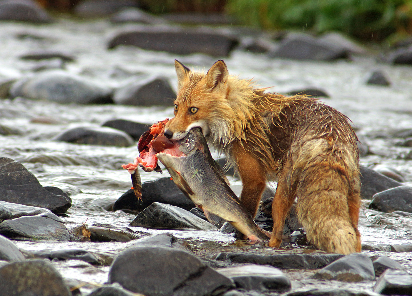 Too good a free meal to pass up, the salmon was struggling up a small creek when picked off by the fox.