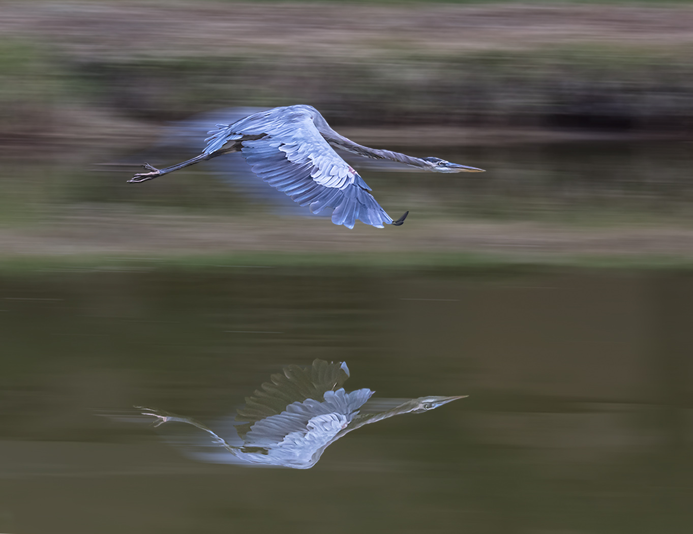 A Great Blue Heron and its reflection appear to be shining through a rapidly streaming scene. Copy, paste heron and reflection to new layer in Photoshop. Massive motion blur of entire scene including the heron. Make Heron layer visible to create speed sensation with the slipstream effect from blurred heron wings.