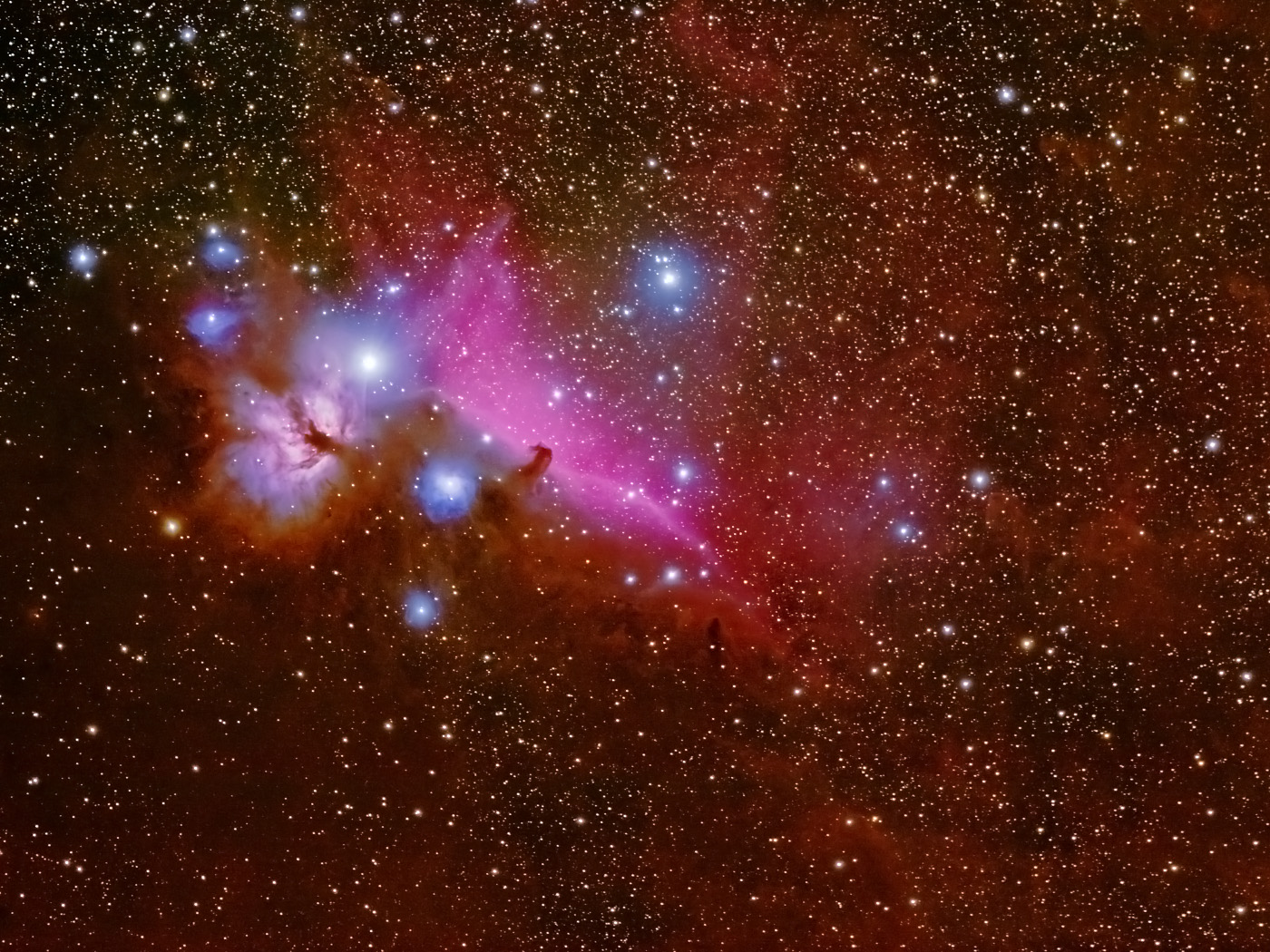 Around the lower left (eastern) star (near center in the above image) in the belt of Orion are many faint nebulae. At the very top of the image is the center star of Orion's belt called Alnilam. The beautiful Horsehead nebula (center) is made of dark dust in front of an emission nebula (reddish-pink). The bright nebula to the lower left of the belt star is the emission nebula NGC 2024 (to the left of the Horsehead nebula).