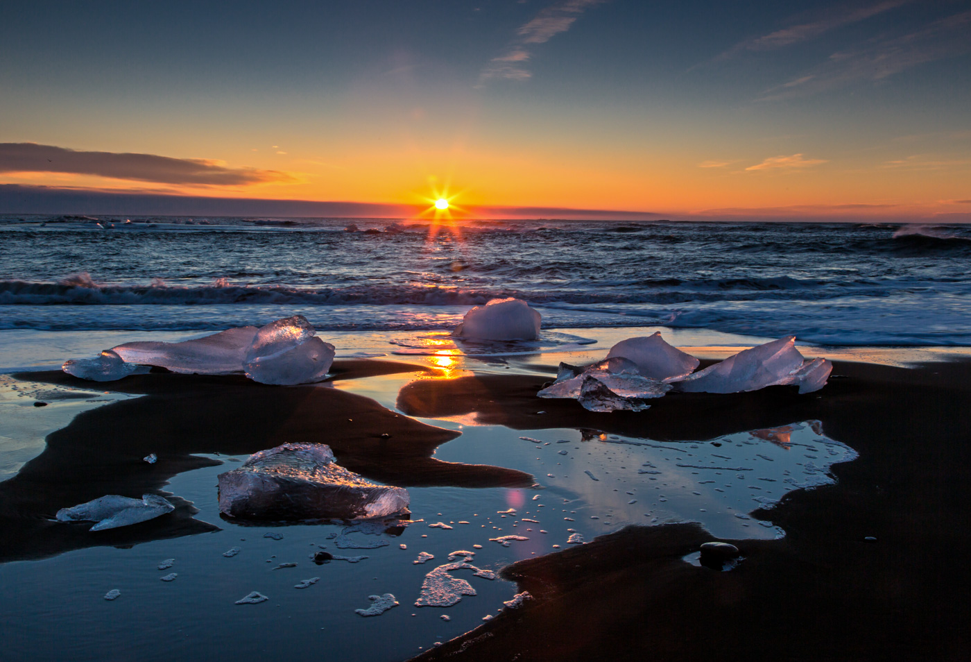 Glacial Ice reflecting the rays of the sun at Sunrise