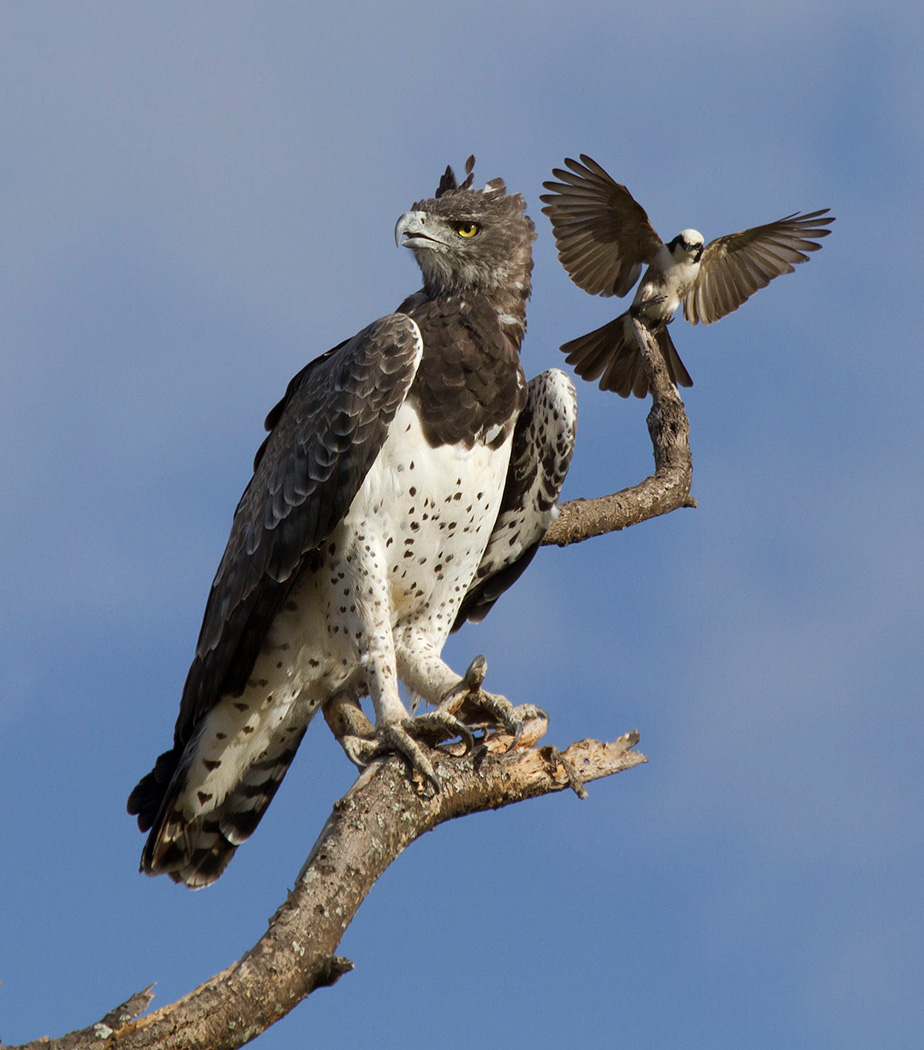 This Marshall eagle appeared unimpressed by the Northern White-crowned shrikes that were persistent in their attempt to disturb it enough to move on.