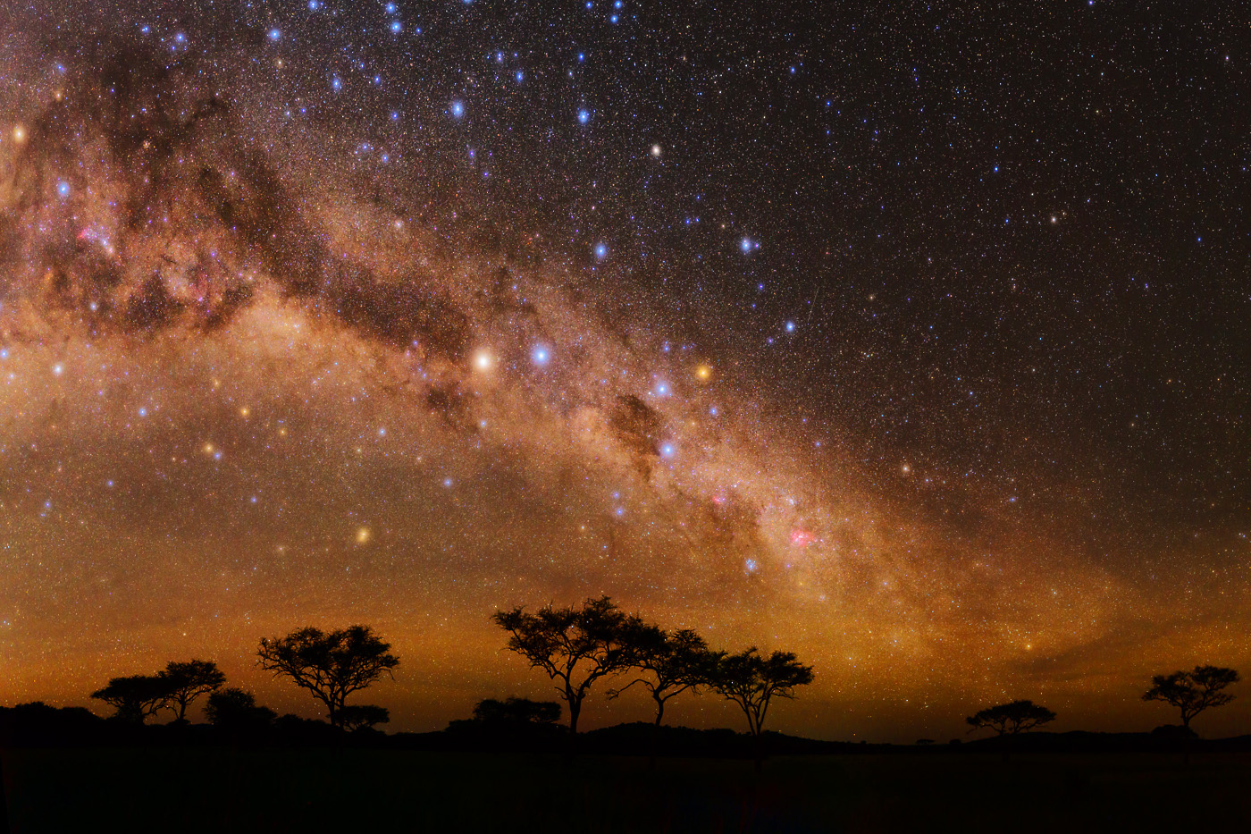 21 frame mosaic of 30-second exposures on the southern Milky Way and acacia trees.