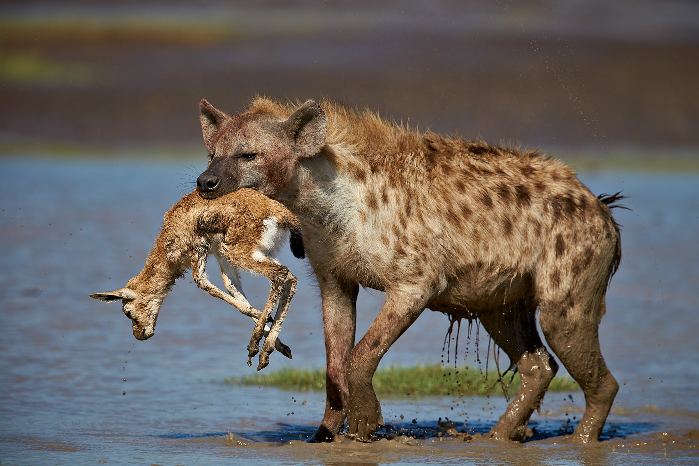 Taken in the Serengeti on my recent photo safari to Tanzania. We followed this spotted hyena carrying a baby Thomson's gazelle for about a mile before it stopped to rest in this pool. The image was taken as it got up and continued on its way.