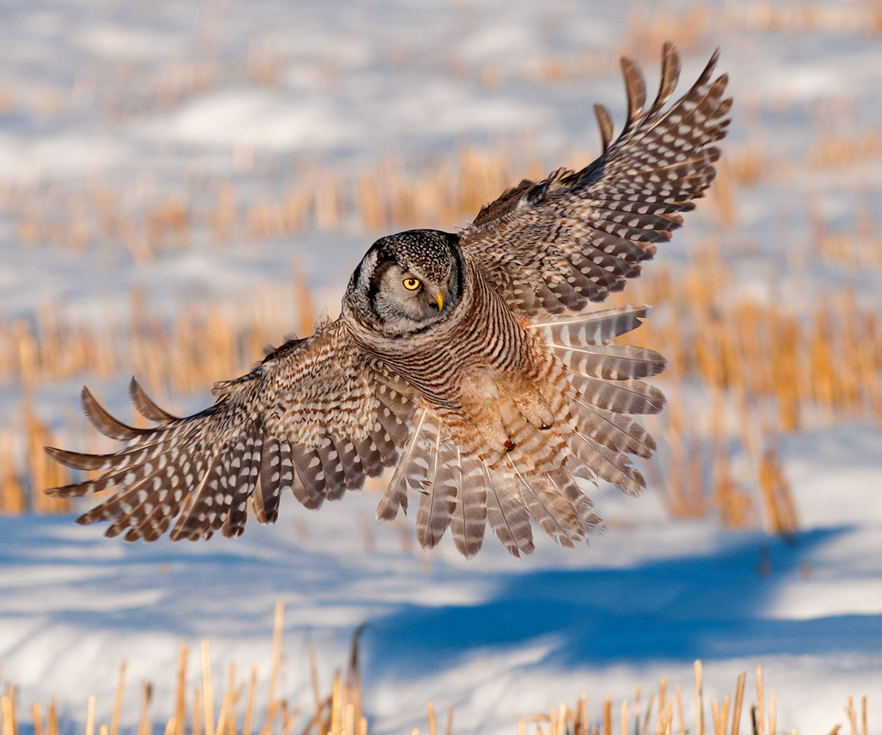 The day was unseasonably warm and the last rays of sun made the world gold with color when at last a single Northern hawk-owl flew low over a field of harvested hay. I was so excited and nervous, to get a shot of this fast little owl that I so hoped to see while on my trip to Canada. But with the added light of the snow on the ground to help my shutter speed, I captured this image. It became one that was my favorite of the trip.
