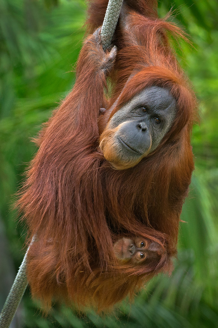 Aisha, San Diego Zoo's youngest Orangutan gripped tightly to her Mom as she swings through the exhibit in search of food. Aisha will be 2 years old in October.
