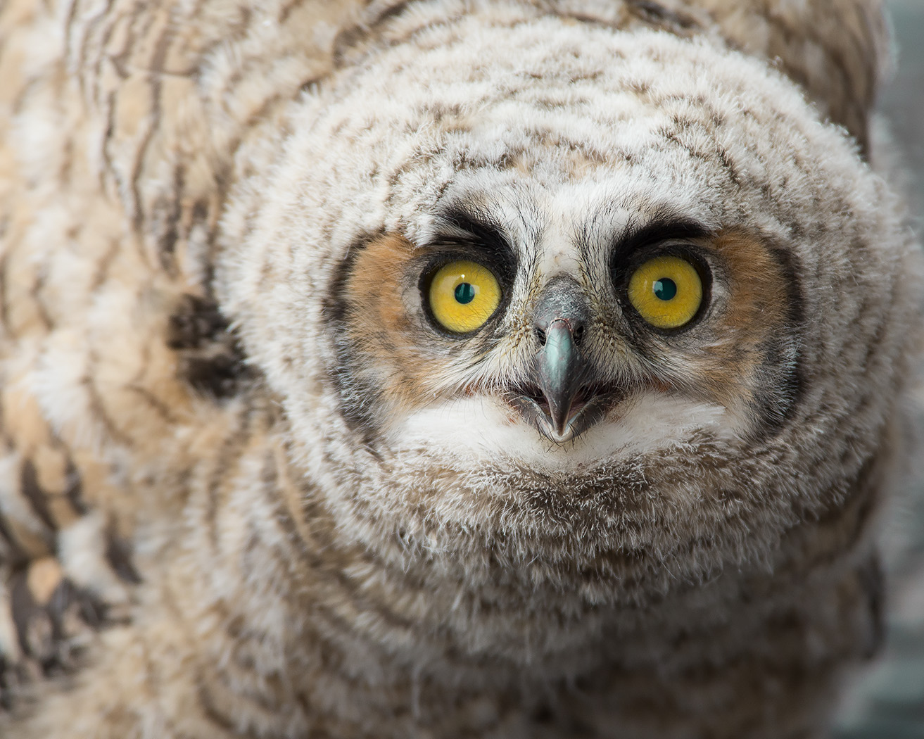 One of the Baby owls we had the joy of watching daily. This was its first day out of the nest, it decided to go a block away and was sitting in front of the door to the Montisori school and was not letting people pick up their kids. The school called to let me know it was over there so I was able to get some fun shots before we encouraged it away from the door. The door glass had a mirrored finish and the owl was just looking at itself while the kids were inside having a blast watching it.