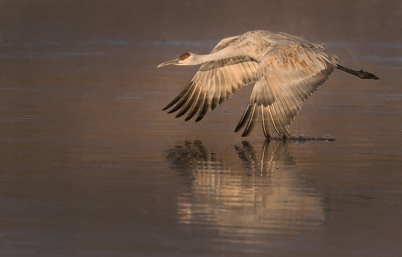 Sandhill Wing Skim: This image was made during my December tour to Bosque and White Sands National Monument. Whenever birds in flight are over water, I strive to get the reflection in addition to the wings skimming the water.