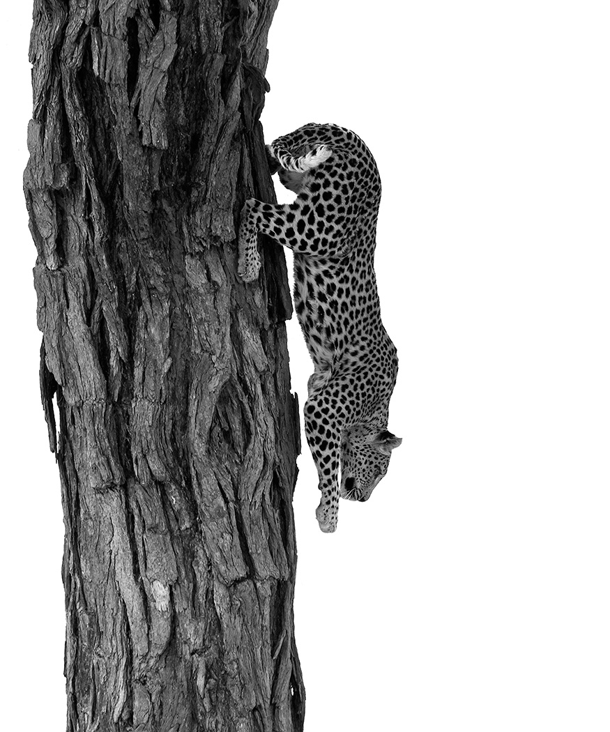 A young female Leopard leaps from the tree as she continues her hunt. Converted to black and while from color.