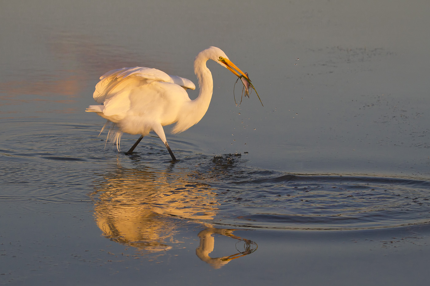Great egret in Estero Bay in Florida having a snack as the setting sunlight glows orange on his white feathers.