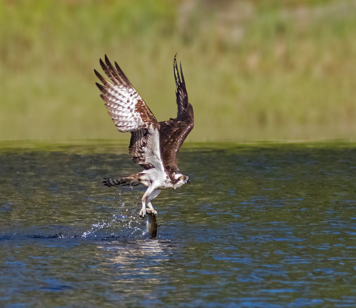 Fly Fishing - An osprey emerges from its dive with an overweight fish and drags it along the water surface as it tries to gain altitude for delivery to the nest. Did it succeed?
