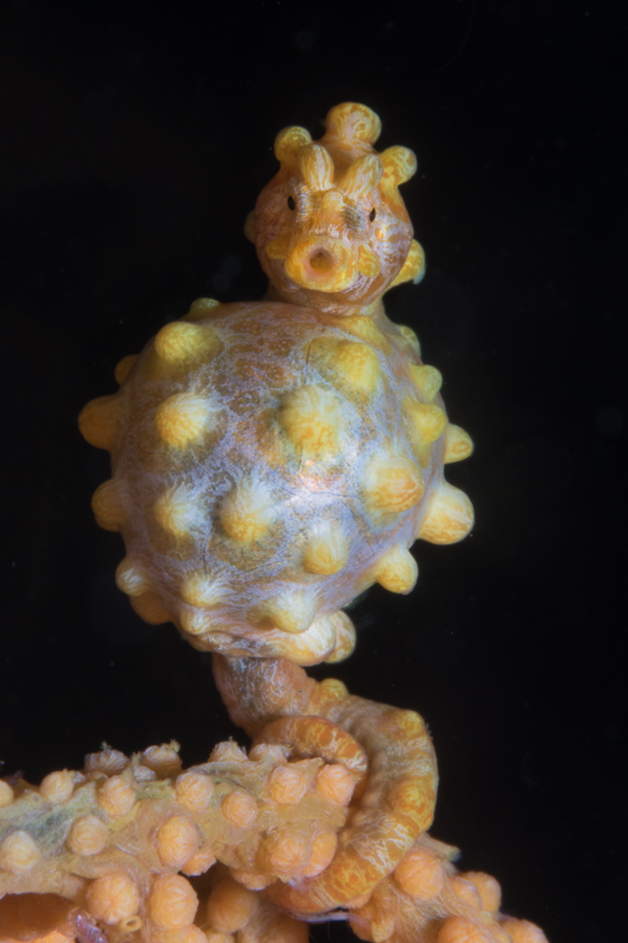 Pregnant male Bargibanti Pygmy Seahorse, size less than 3/4 ",100 mm macro with + 5 wet diopter