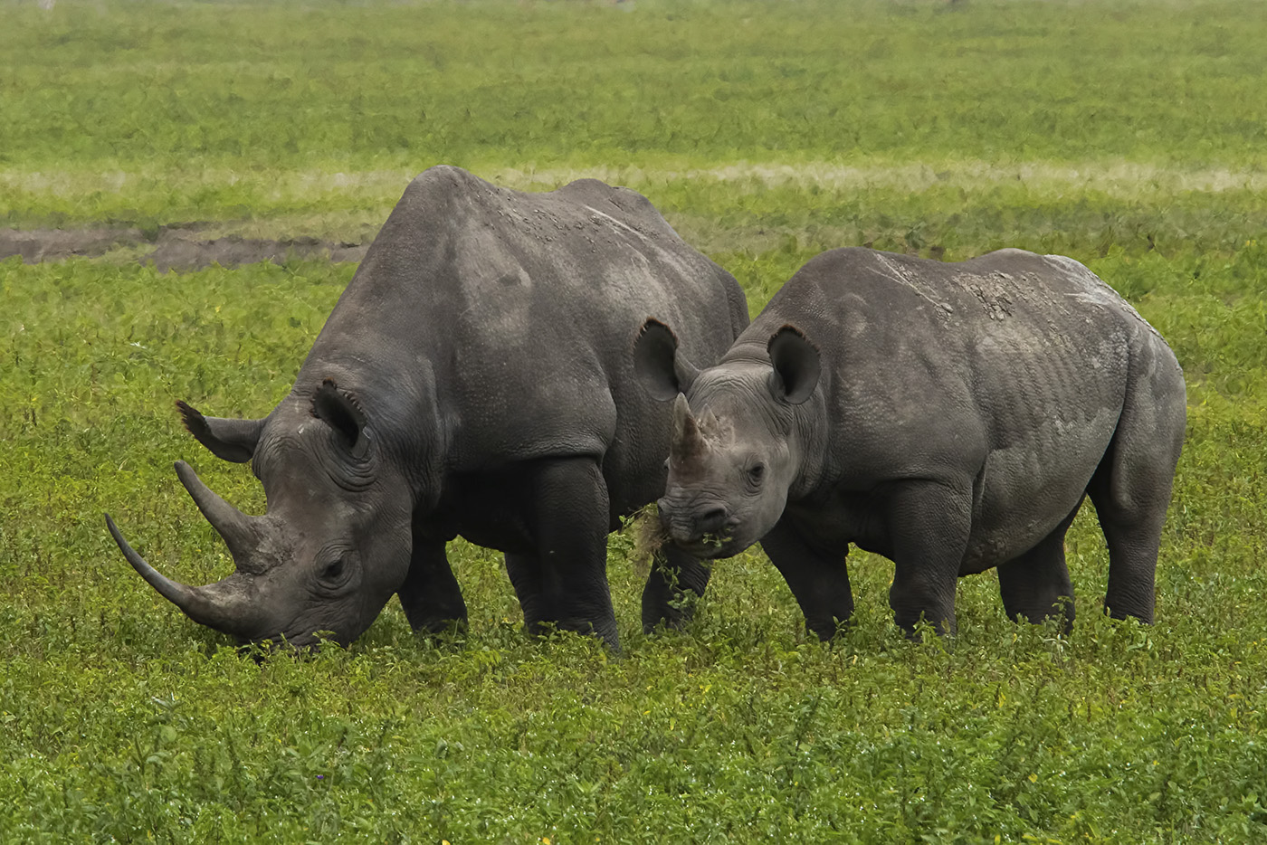 The Ngorongoro Crater, a large volcanic caldera, is home to 25+ black rhinoceros. Most times they are seen far off in the distance , but on this particular visit in February, we were fortunate enough to see several females with calves, with one pair passing very close by our vehicle.