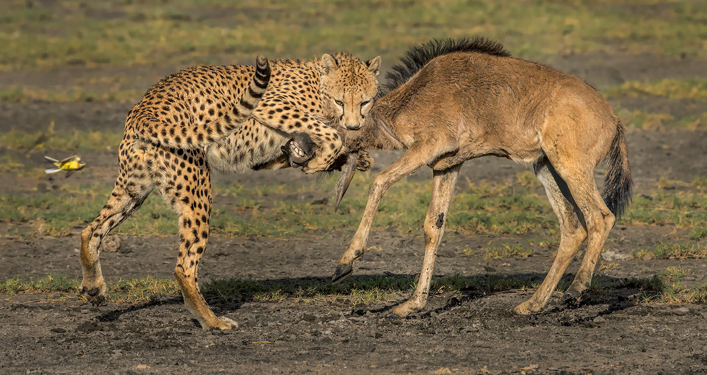 While in the Ndutu area of the Serengeti, a lone female cheetah sat by a tuft of grass. Not overwhelmed by the static pose she struck, we decided to stay hoping something would happen. Unknown to us, the cheetah saw a stray young wildebeest that got separated from the herd. The cheetah went into full run and the chase began. To see this occur in short grasses made us all fell very privileged. After the kill was made, the mother called in her two cubs. It was an ultimate Serengeti event. Nikon D7200 80-400 Nikkor lens ISO 800 1/3000 sec f6.7